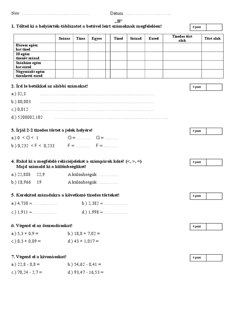 Témazáró Dolgozat Témazáró Felmérő Feladatsorok Matematika 5 Osztály